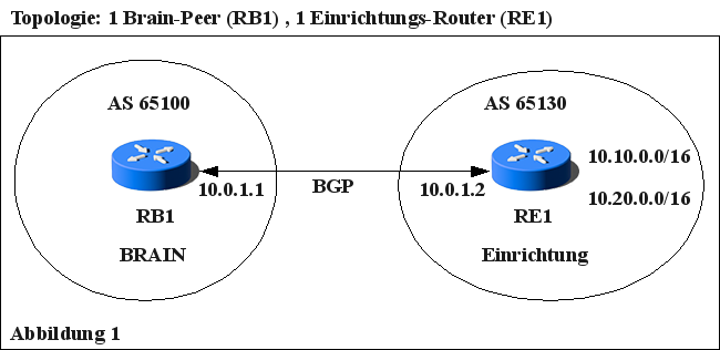 Transit-Netz: 10.0.1.0/30 BRAIN-IP: 10.0.1.1 Einrichtungs-IP: 10.0.1.2 BRAIN-AS: 65100 Einrichtungs-AS: 65130 Von der Einrichtung zu annoncierende Netze: 10.10.0.0/16 10.20.0.0/16![]()