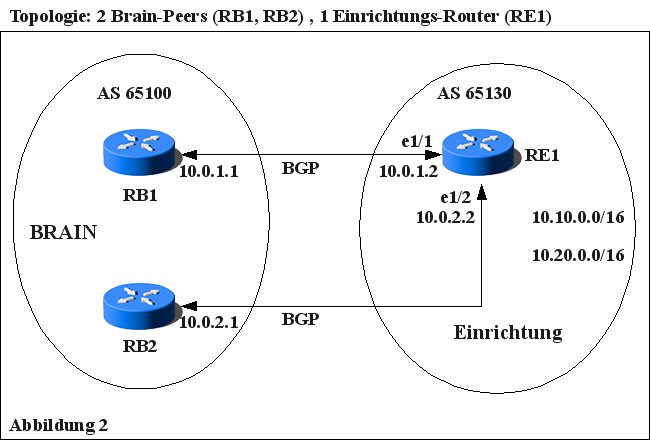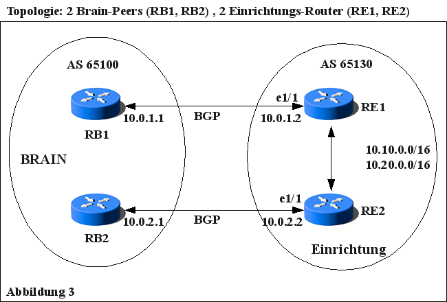 Diese Konstellation unterscheidet sich nur unwesentlich in der Konfiguration von Peering von einem Einrichtungs-Router zu zwei BRAIN-Peers. Der zweite Einrichtungs-Router sei RE2 und habe eine Verbindung zum zweiten BRAIN-Router RB2 über Interface e1/1 (Abbildung 3). Auf RE2 wird ebenfalls ein Transitnetz zu RE2 eingerichtet: