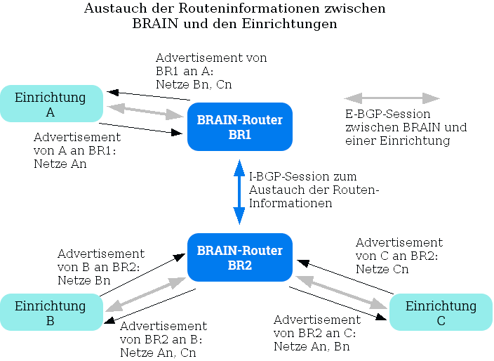 Die Routing-Informationen der von BRAIN und den Einrichtungen erreichbaren Zielnetze werden über das Routing-Protokoll BGP4 (RFC 1771) zwischen den BRAIN-Routern und den Einrichtungs-Routern ausgetauscht. Dazu wird zwischen beiden Routern ein Transportnetz konfiguriert und über dieses Transportnetz ein BGP4-Peering aufgesetzt.