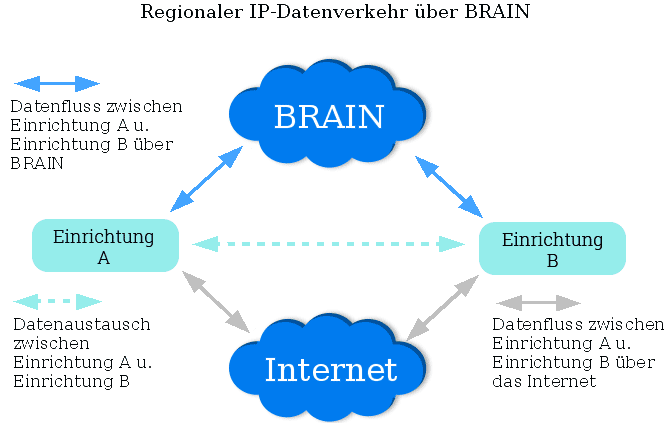 Nimmt die Einrichtung am Dienst „Regionaler IP-Verkehr im BRAIN“ teil, werden Daten zu anderen BRAIN-Teilnehmern, die auch an diesem Dienst teilnehmen, direkt über den Backbone ausgetauscht. Die Quell- und Zieladressen der IP-Pakete müssen aus den Netzen der an diesem Dienst teilnehmenden Einrichtungen stammen.